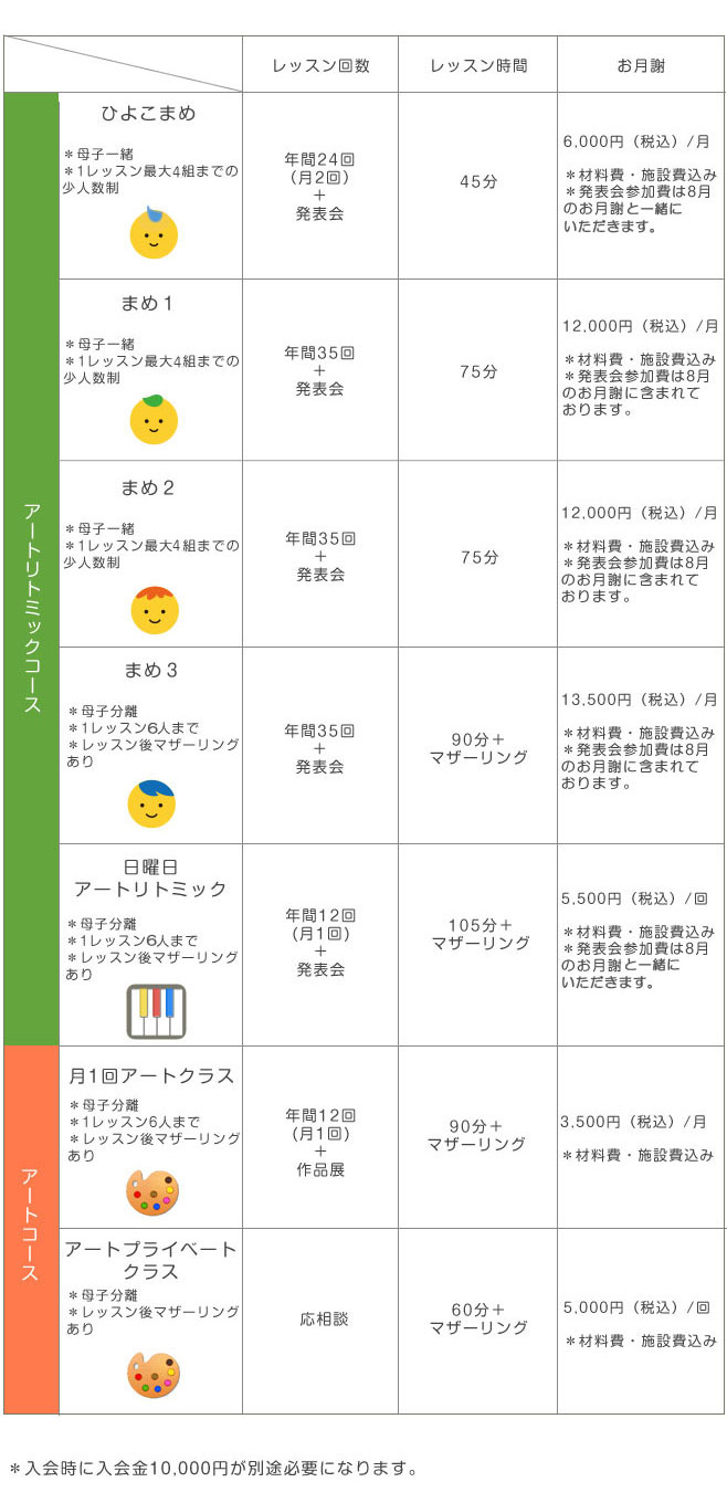 *まめ3、月1回アートクラスは振替レッスンを行っております。詳しくはお問い合わせください。
